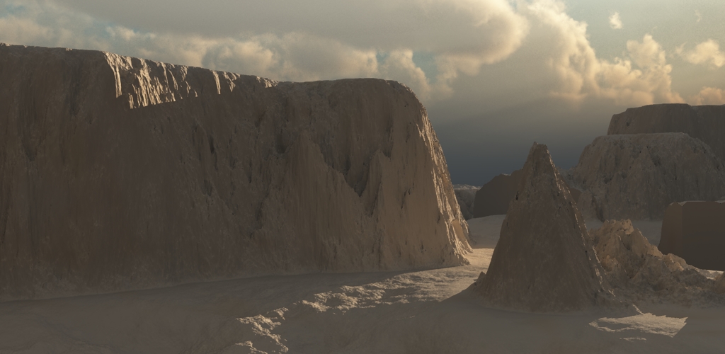 Habe das Bild ins Breitbild gebracht, das Licht überarbeitet und hinten rechts noch einige Felsformationen hinzugefügt. Eigentlich sollten vorne einige Kakteen stehen, leider stürzt bei mir Vue aber nach einem Update immer ab wenn ich den Pflanzen-Objektbrowser öffnen will und ein ordentliches Ersatzmodell für einen Kaktus ließ sich bisher im Internet nicht finden. Von daher nur ein "Zwischenstand" - da muss ich mir im Vordergrund noch was überlegen.