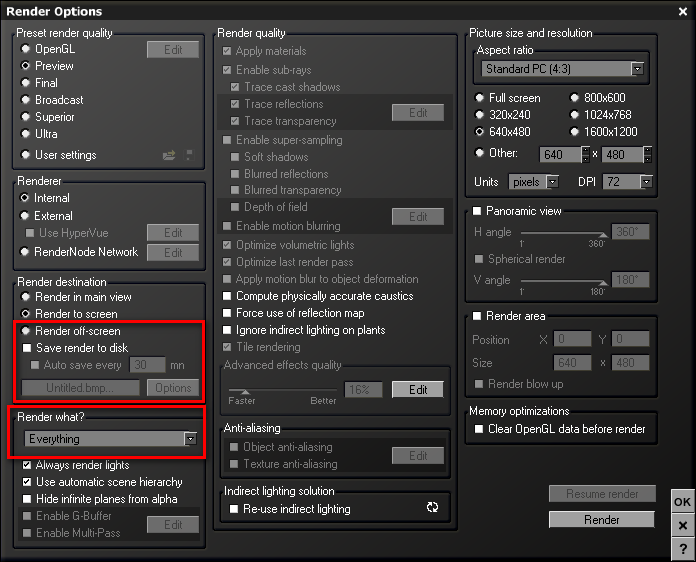 Neu hinzugekommen ist die Option "Render off-screen" und die Auto-Save-Möglichkeit.