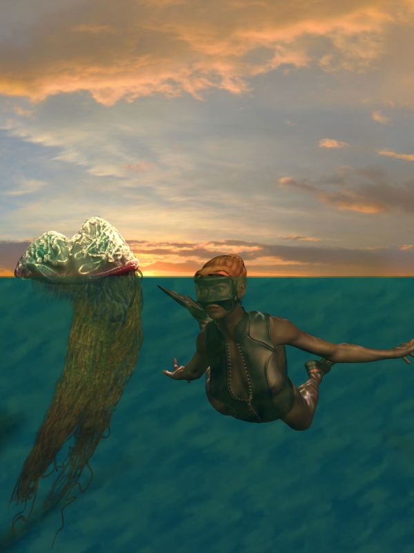 Ich hoffe nur die Taucherin weiß das auch. Sie ist so nah dran, das könnte bös ausgehen! Etwas mehr Transparenz für das glibberige Ding wäre vielleicht gut. Ansonsten kommt es der Sache schon sehr nahe.