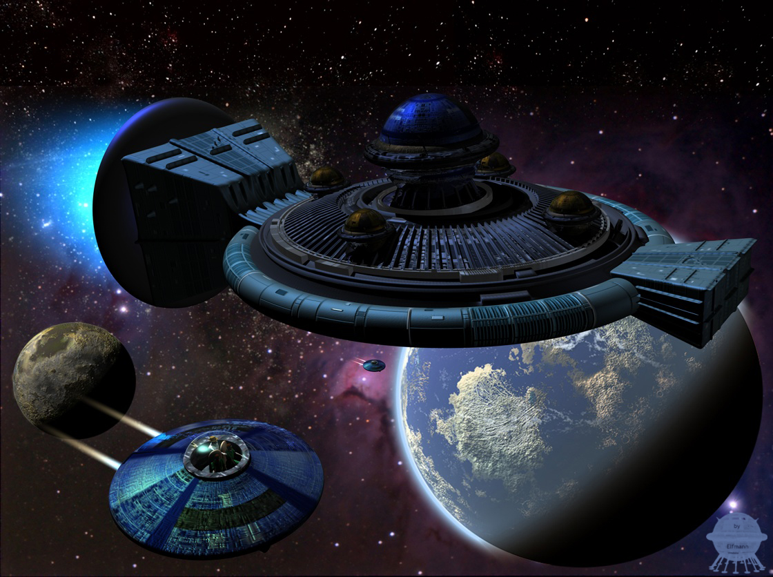 @SirM: Ich muß Dir recht geben, die perspektivischen Größenverhältnisse sind nicht recht stimmig. Die BASIS hat, wenn ich mich richtig erinner, 12 km Länge. Ich hatte so positioniert, dass die vordere Kleinspacejet direkt unterhalb des Betrachters entlangfliegt und die BASIS einen Abstand von mehreren Kilometern zum Betrachter hat. Im luftleeren Raum fehlen ja uns bekannte Anhaltspunkte, die die Entfernung abschätzen lassen, damit rede ich mich jetzt heraus.