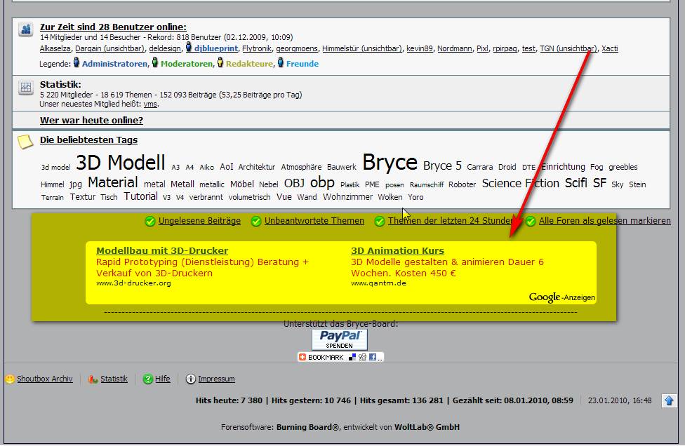 @ DJ: Jetzt fällt es mir wieder ein, ich habe AdblockPlus für Chrome vor kurzem installiert. Sorry, mein Fehler. Kontextsensitiv ist sie ja bereits (wie du auch schon sagtest), ich denke aber, es könnte mit "besserer" Werbung (die jetzige passt zwar irgendwie, ist aber null interessant für alle hier und zu spezialisiert - woher kommt die Werbung?) und einer besseren Platzierung (nicht am Seitenende, da guckt eh nie jemand hin) mehr erreicht werden.