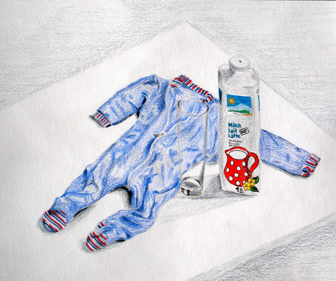 Die drei Gegenstände waren vorgegeben. Kleidung, Glas und Milchpackung. Wie man das dann schlussendlich darstellt, war der eigenen Kreativität überlassen.