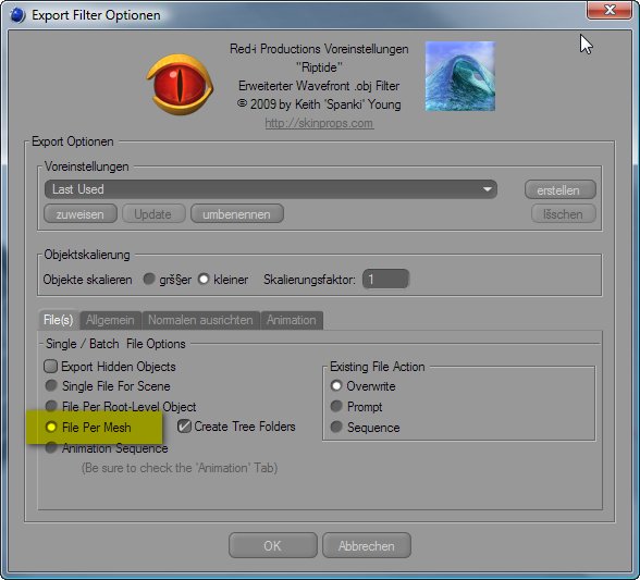 Mit der auf dem Anhang hervorgehobenen Option macht er dir pro Objekt in Cinema eine einzelne OBJ-Datei im Export.greetz