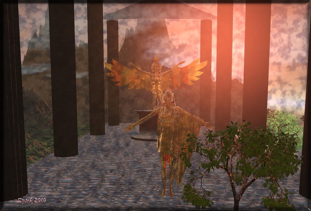 Auch entsteht eine gesteigerte Bilddynamik, wenn der Hauptgegenstand etwas ausserhalb der Bildmitte liegt, ohne dabei seinen "Eyecatcher"-Charakter einzubüssen. In Deinem Falle könnte ich mir z.B. vorstellen, den Säulengang ganz leicht zu verdrehen, die Isis -sozusagen als Hauptdarstellerin- etwas nach vorn zu holen, evtl. als hellstes Objekt in der Szene. Selket als Beschützerin -quasi als die ominöse "Macht im Hintergrund"- könnte dann dicht hinter ihr stehen, deutlich grösser aber dabei mit höherem Transparenzeffekt (als Symbol für die geistige Welt)...
