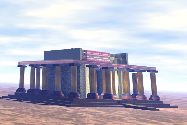 Was mir aber beim Rendern erst aufgefallen ist: obwohl alle Säulen, Plinthen und Tori Kopien des ersten Exemplars sind, sind sie zu kurz, zu lang oder komplett ineinander verschoben. Infolge sieht mein Tempel aus, als sei der unfähige Architekt aus "Asterix in Ägypten" am Werk gewesen.