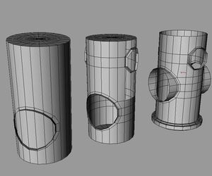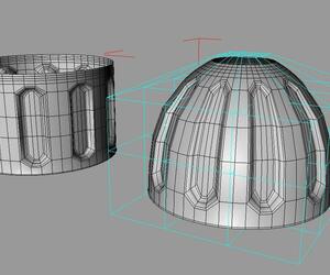 Die dicken Bolzen auf den Kappen sind nicht aus der Kappe modelliert, sondern aufgesetzt. Das ist einfacher und benötigt letztlich weniger Polygone. Um die Verbindung mit den Kappen vorzutäuschen, erzeugt man einfach unten einen gebevelten Bereich, der dann in die Geometrie der Kappen hineinsteht. Eine einfache und wirksame Methode, um eine Verbindung zu faken. Gerendert sind das hinterher ziemlich glaubwürdig aus. 8|