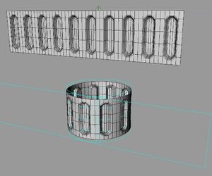 Das fertige Segment wird dupliziert, die Kopien verbunden und das resultierende Objekt mit dem Wrap-Deformer in die runde Zylinderform gebracht.