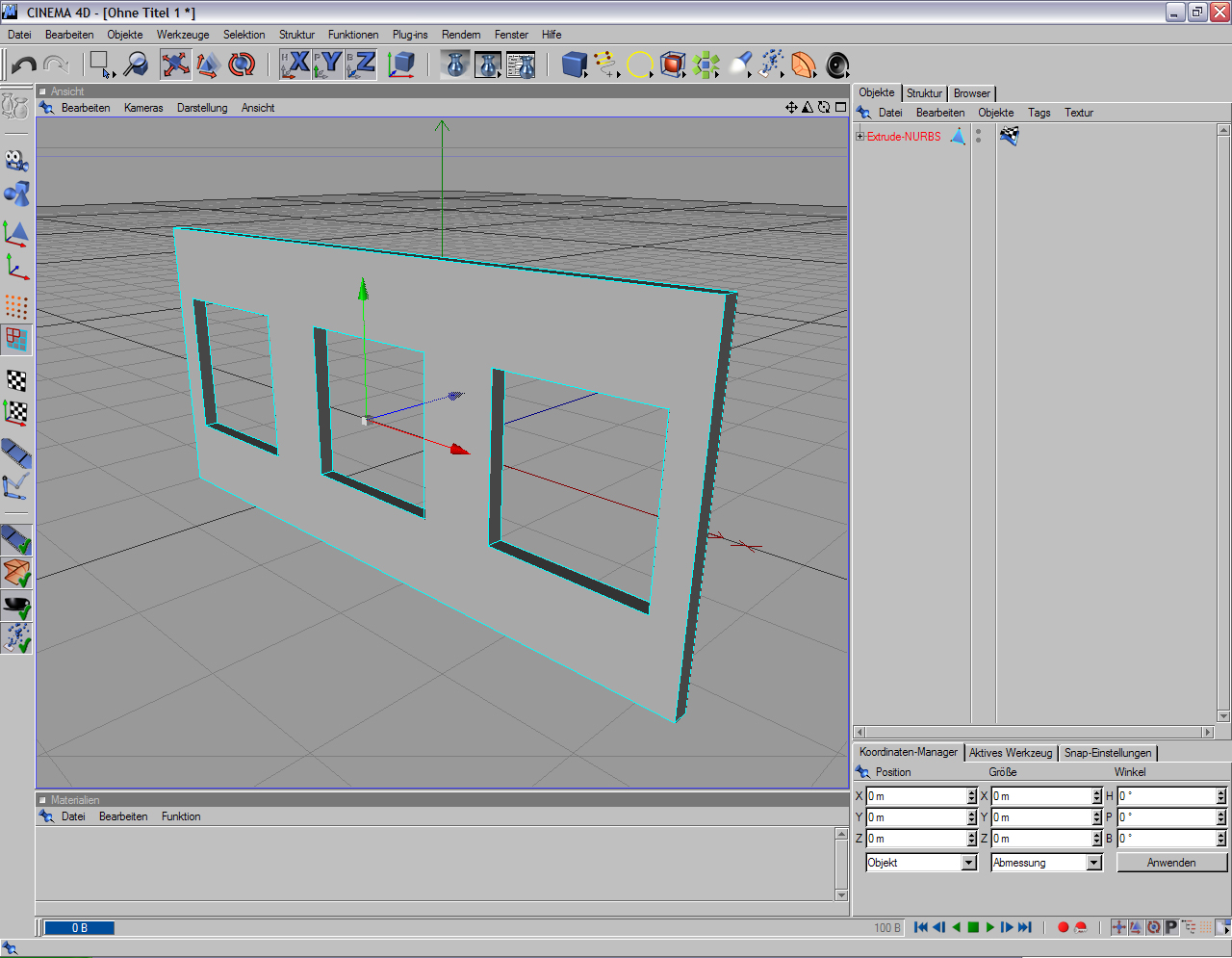 Also ein Rechteckspline, ein kleineres darin, beide konvertiert, verbunden, ExtrudeNurbs, konvertiert ohne Linien.