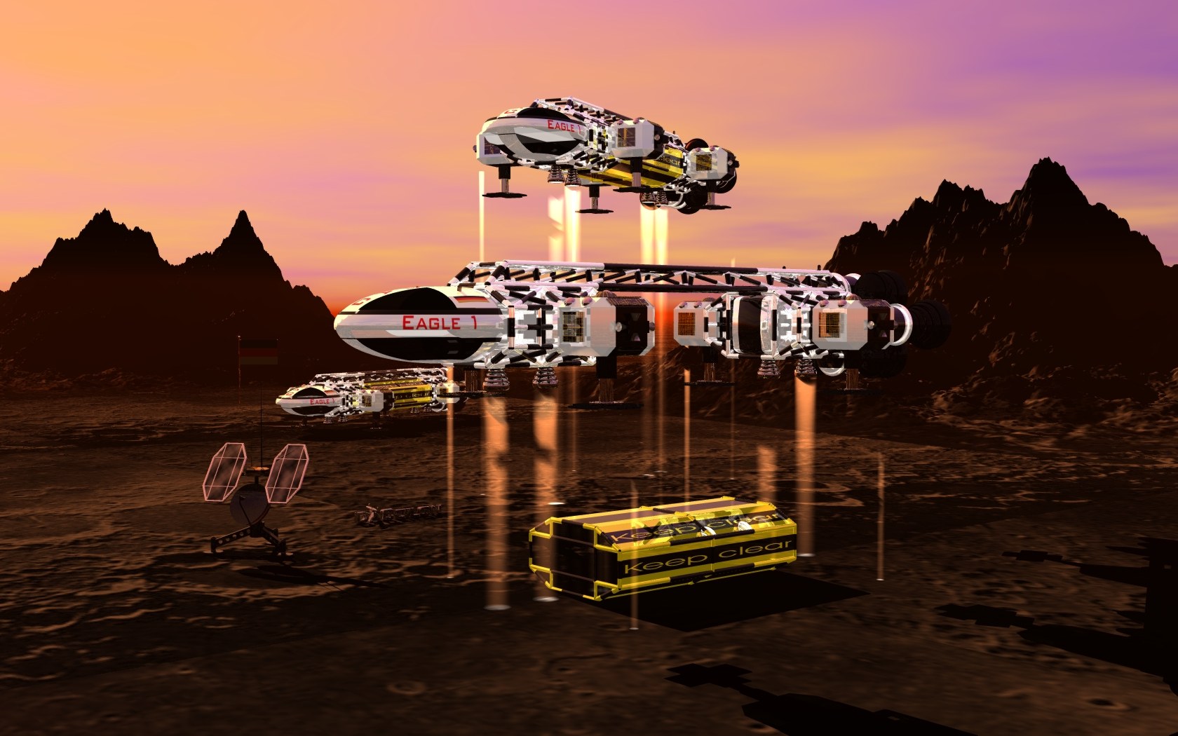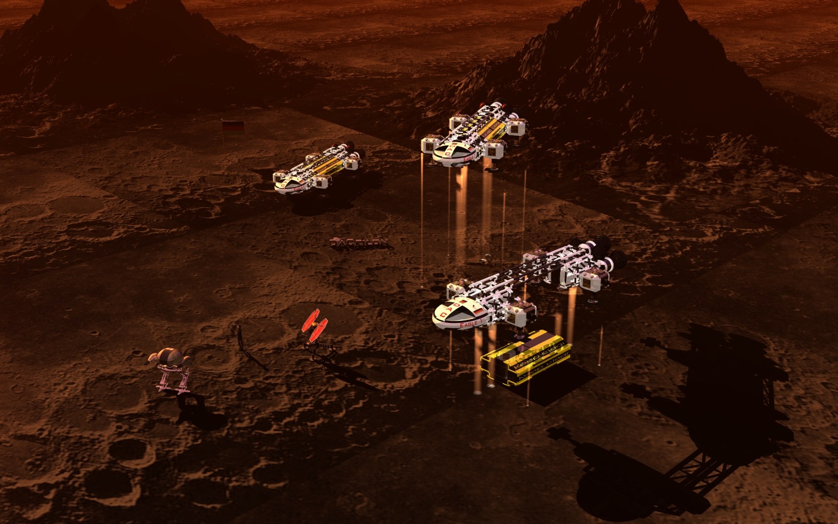 sowie der schwarze Render-Schatten des Schiffes im Vergleich zu den schwachen Textur-Schatten der Kraterränder.
