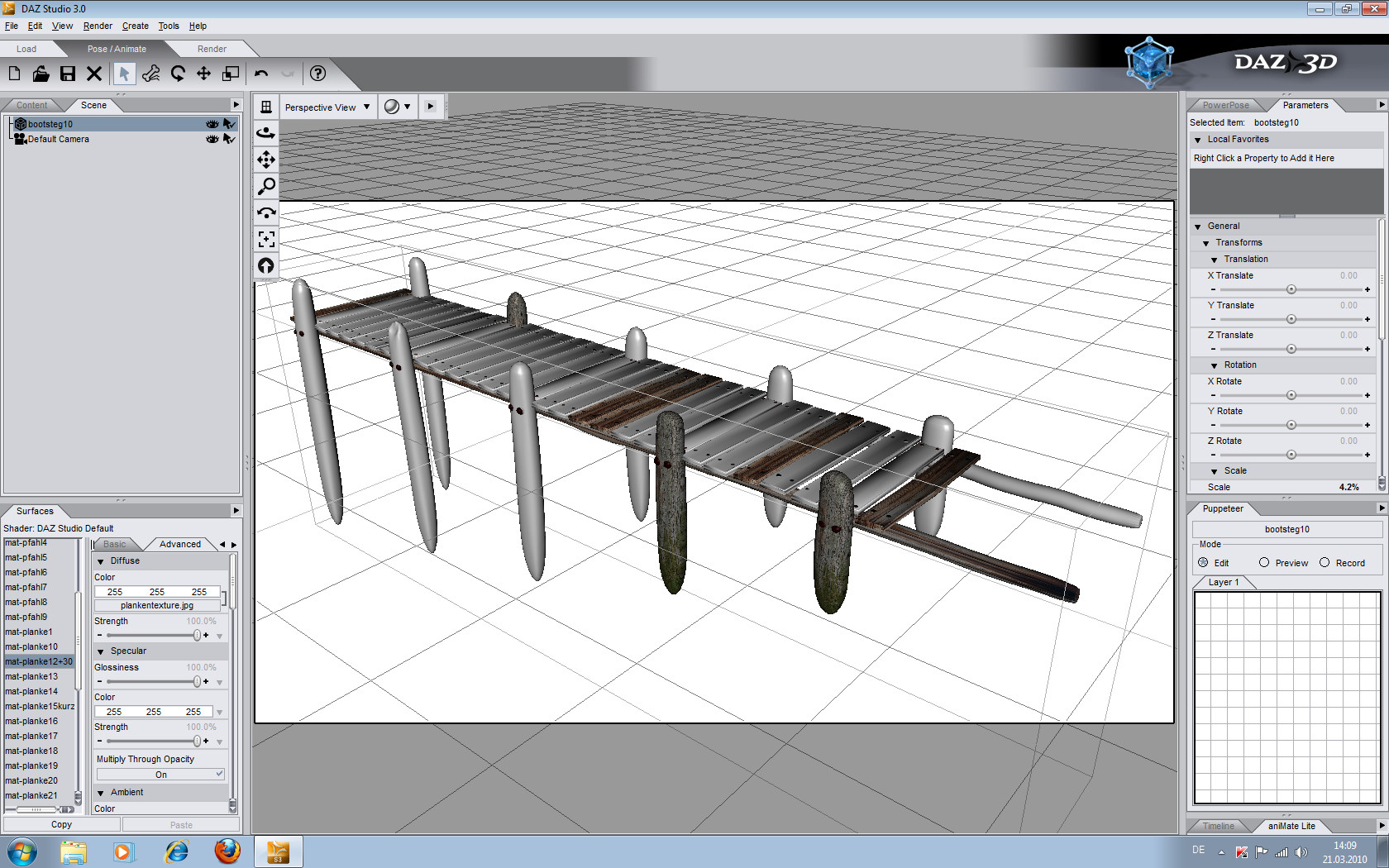 Die Planken habe ich auch schon mit Gizmos versehen und texturiert. Muss mir dann noch aussagekräftige Namen für die ganzen Materialien ausdenken, weil das schon ein ziemlicher Wust geworden ist, da jede Planke ihren eigenen Gizmo hat. In DAZ-Studio muss ich ja nacher alle Texturen/Bumpmaps über den Surface-Tab wieder auf das obj.-file raufpfriemeln und als Scene abspeichern.