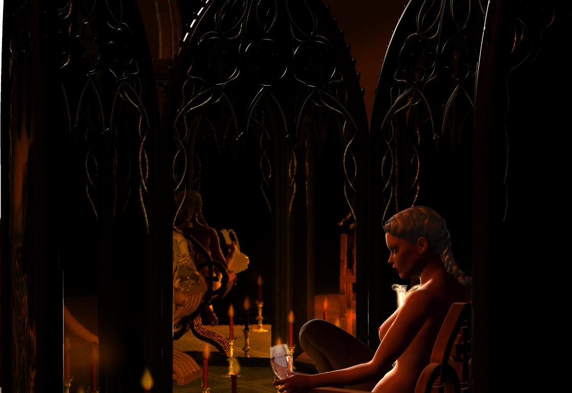 Das mit der ersten direkten Spiegelung ist so eine Sache. Auf jeden Fall wäre das Bild dann nicht mehr Jugendfrei, meine Alkoholikerin ist komplett nackt (Sicher unbequem bei diesem Sessel) und mit dieser Pose hat man dann ziemlichen „Einblick“. ![]()