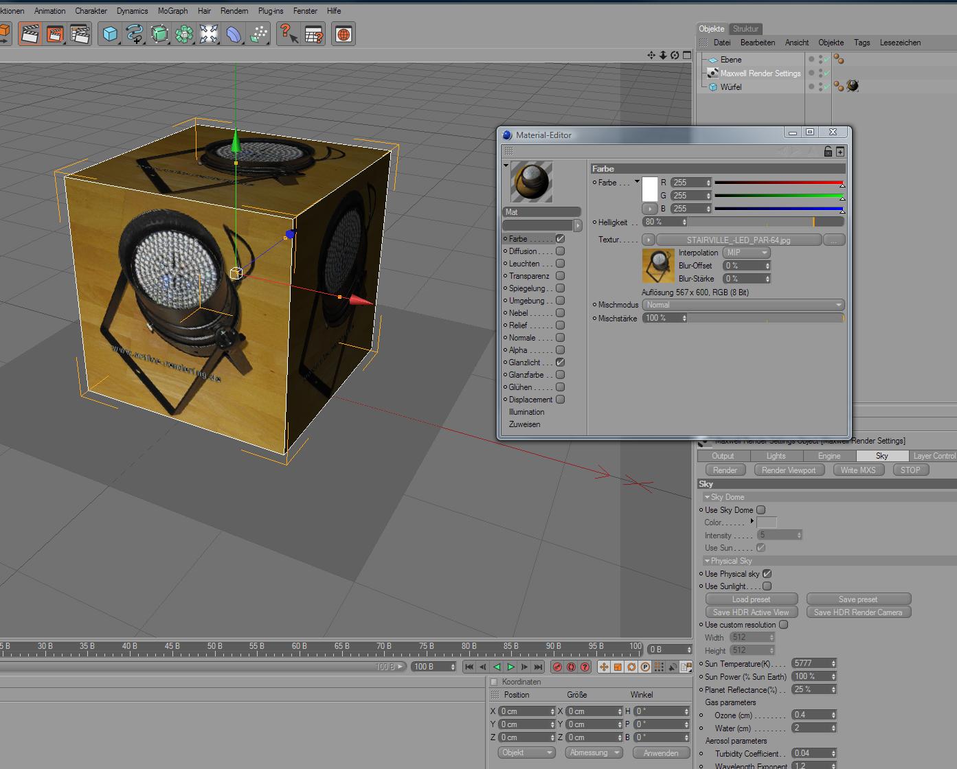 dann stimmt scheinbar tatsächlich etwas nicht bei dir. Ein einfacher würfel mit ner jpg Textur sollte ohne weitere Einstellungen im MW-Render gerendert werden. Da musst du auch nichts umwandeln oder so. Siehe Screenshots. Ggf. probier mal aus, ein Maxwell-Material dem Objekt zuzuwiesen und dann zu rendern.