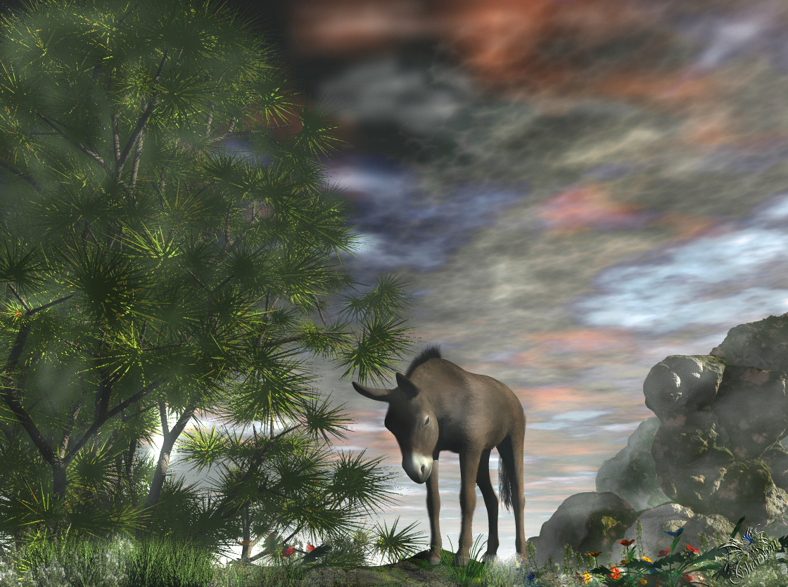 Die Idee des Bildes finde ich schön und ist auch bildlich gesprochen gut umgesetzt. Allerdings schein mir der Esel etwas in der Luft zu schweben. Auch den Himmel finde ich etwas zu bunt, die Wolken sehen etwas flach aus, wenn man da mehr volumen rein bringen würde, wäre die Stimmung die das Bild erzeugt sicher noch besser ![]()