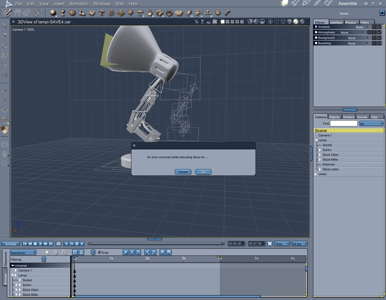 ich hoffe, mir kann jemand weiter helfen. Also ich habe Carrara 8 Pro (Version 8.0.1.2) und habe in Hexagon die Pixar-Lampe nachgebaut. So weit so gut. Um diese bewegen bzw. animieren zu können, habe ich Bones in Carrara hinzugefügt. Wenn ich nun aber den Einflussbereich der Bones ändere, kommt entweder die Fehlermeldung "An Error occurred while executing -" oder wenn ich dann speichern will "An Error occurred while Saving As..."