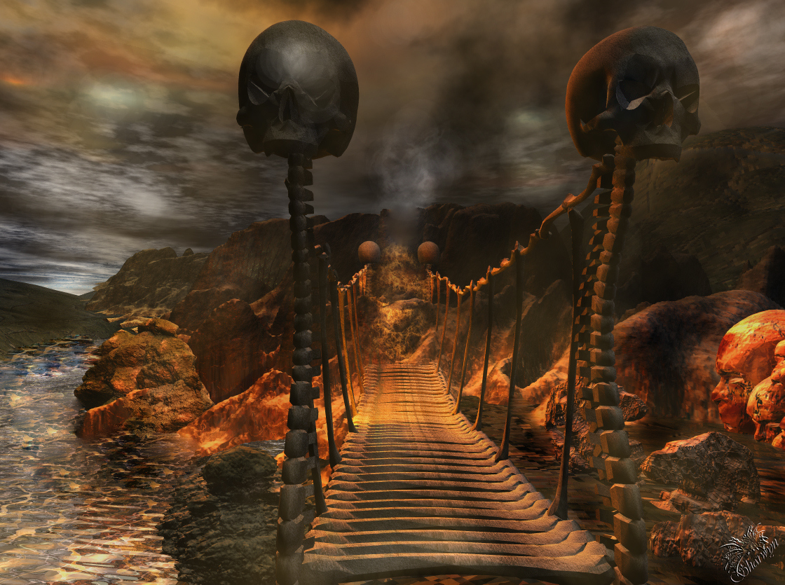 Die vier Schädel als Abschluss des Geländers dominieren mir allerdings zu sehr die Gesamtaussage des Bildes, sehr gross (die zwei im Vordergrund) und sehr dunkel ziehen sie sofort den Blick auf sich und "verwischen" damit etwas den Symbol-Inhalt ins mehr Realistische hinein... ![]()