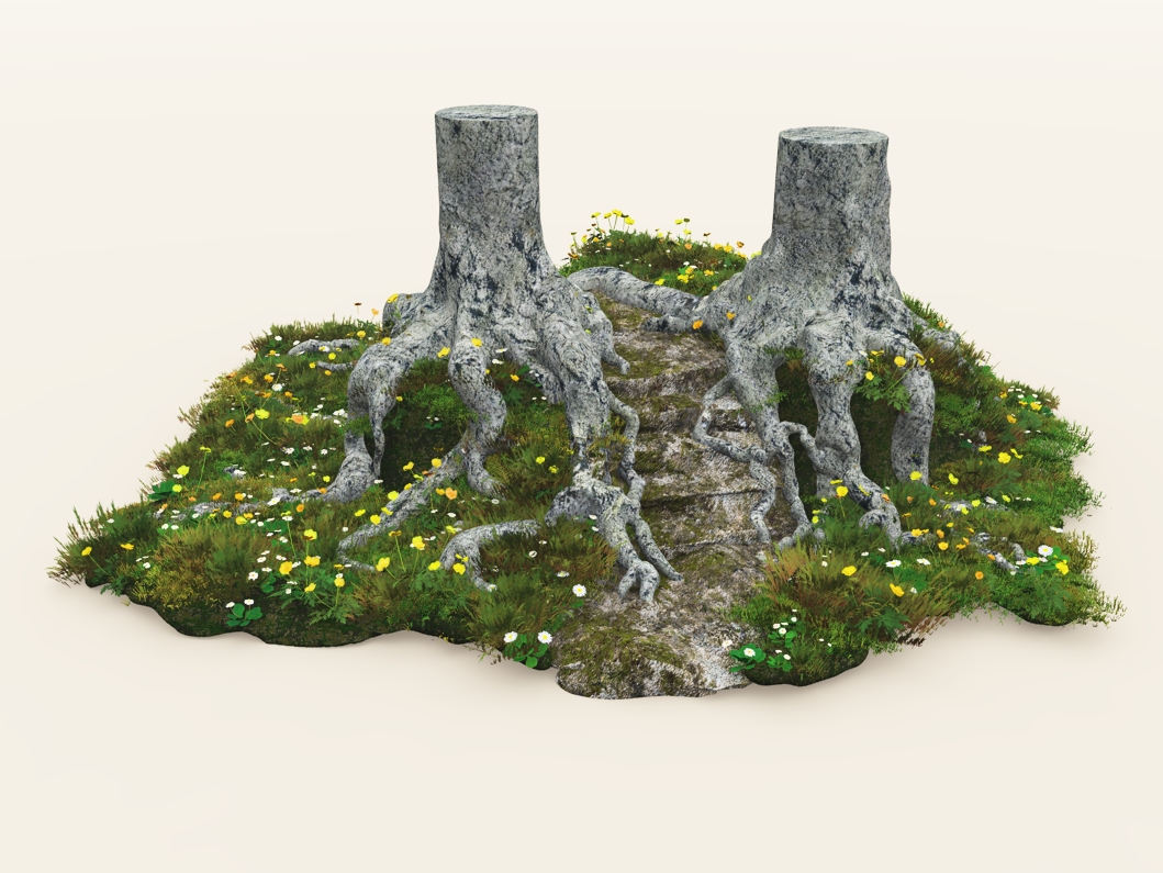 Hier ein erster Rohbau (texturiert & gerendert in Vue), der noch viiieeel Feintuning bekommt: Die zweitunterste Stufe stimmt noch nicht, das Bodenterrain wird noch uneben, daß es sich an die Wurzeln anpaßt, diese werden noch weiter ausgearbeitet und die kleine Treppe bekommt oben und unten einen Pfad. Aus der Sache kann man dann eine wunderschöne Waldszene à la HdR bauen.
