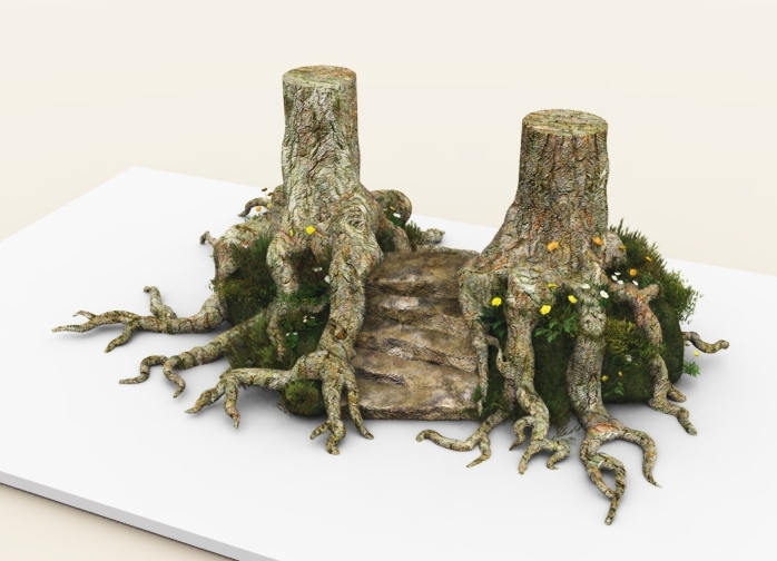 Hier ein erster Rohbau (texturiert & gerendert in Vue), der noch viiieeel Feintuning bekommt: Die zweitunterste Stufe stimmt noch nicht, das Bodenterrain wird noch uneben, daß es sich an die Wurzeln anpaßt, diese werden noch weiter ausgearbeitet und die kleine Treppe bekommt oben und unten einen Pfad. Aus der Sache kann man dann eine wunderschöne Waldszene à la HdR bauen.
