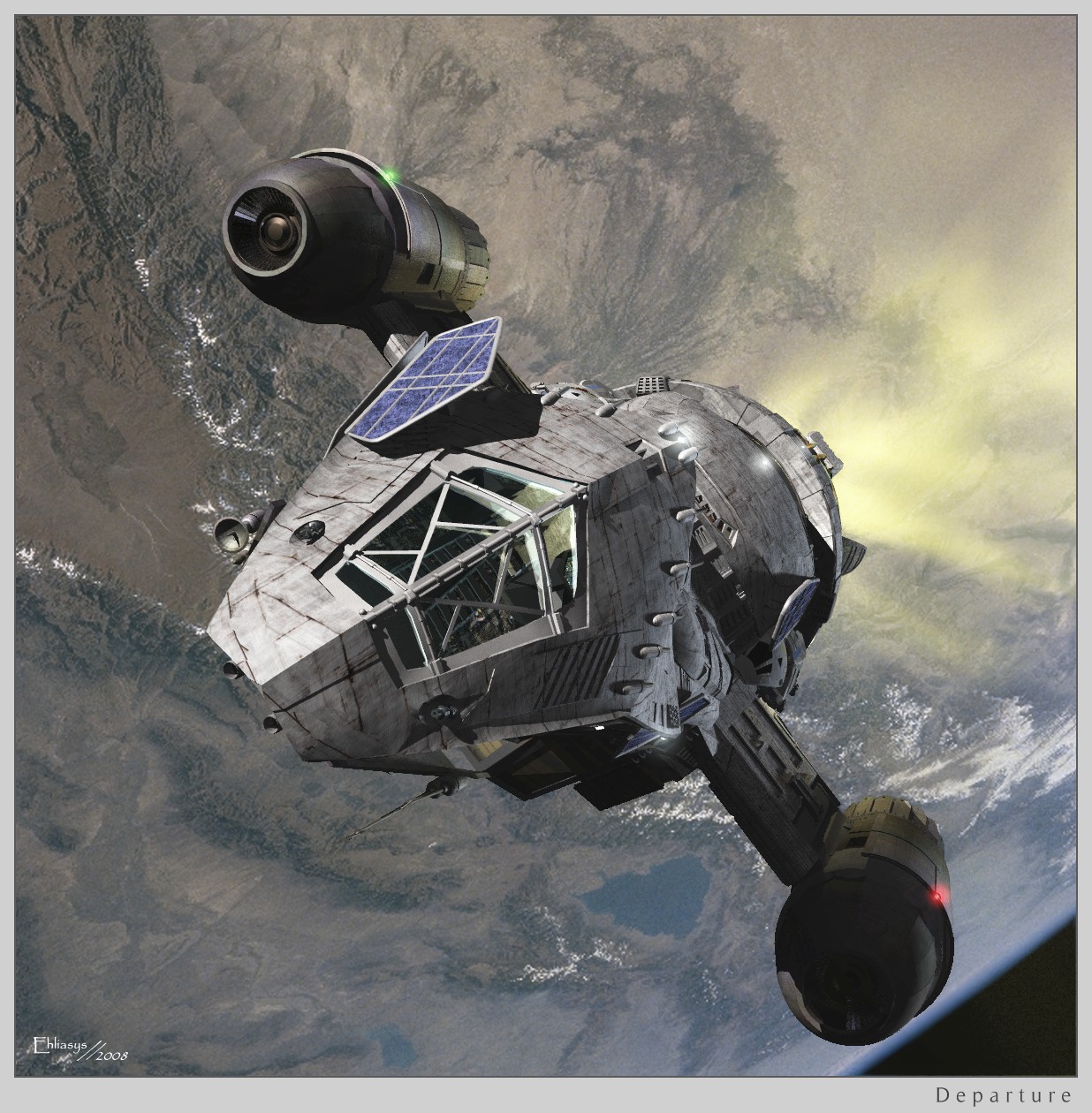 Ich weiß nicht,ob jemand hier die SF-Serie "Firefly" kennt - eine der besten Science Fiction Serien überhaupt, in den USA leider vorzeitig abgesetzt und hierzulande nur auf DVD erhältlich - oder den (nicht ganz so gelungenen) Kinofilm... jedenfalls dies hier ist die "Serenity" beim Aufbruch zu neuen - meist nicht ganz legalen - Aktivitäten.