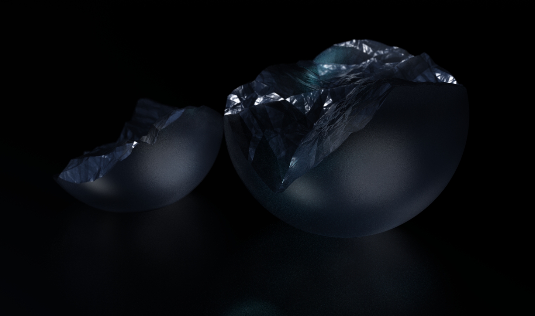 einer Kugel mit terain den oberen Teil weggeboolt,Glastextur drauf fertig . Das Ganze kopiert, gedreht, geboolt als schnittmenge .Gegenstück.Hintergrund Dunkel.