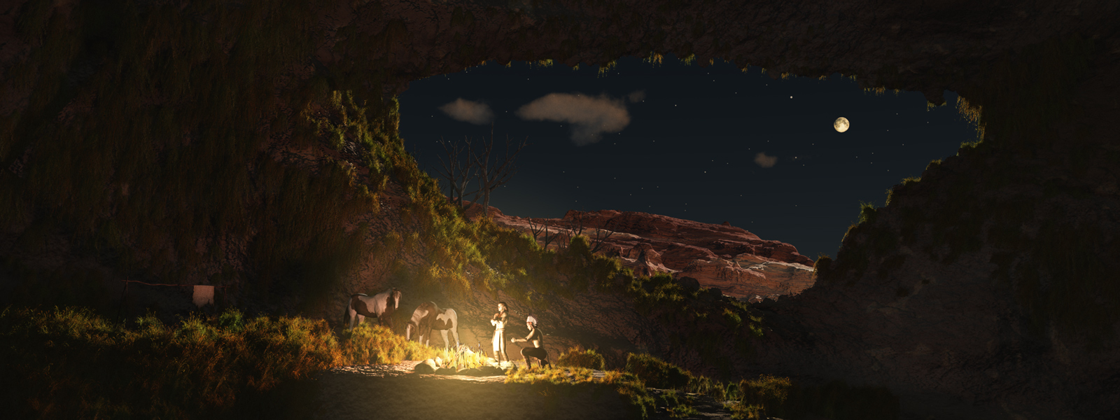 Vielleicht sind die Felsen außerhalb der Höhle etwas zu hell - selbst für eine klare Mondnacht, aber das Lagerfeuer und das Rimlight um den Höhleneingang machen echt was her.