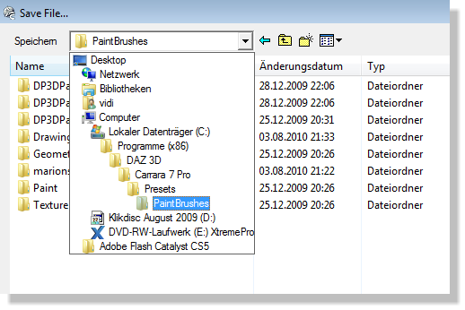 Solltest sich das auf meine Anleitung beziehen dann kannst du den brush ja speichern und hast ihn damit in ein Carrara Brush konvertiert , den kannst du dann auch in den Carrara Brush Ordner Ablegen . Wie du siehst kann mann dann auch einen eigenen Ordner für seine Brushes anlegen.