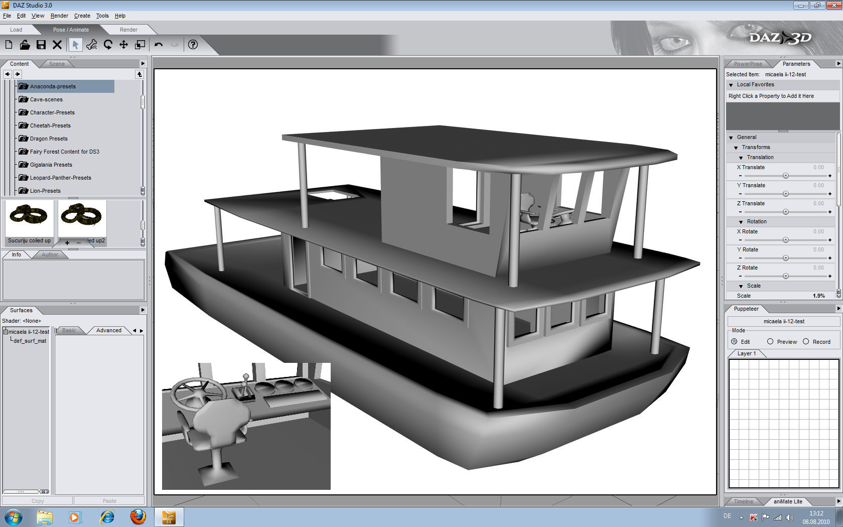 Es wird keine 1:1-Kopie des Film-Bootes, aber die "Micaela II" nimmt langsam Form an. Ärgerlich: Einzelne Teile durfte ich neu modellieren, da ich mit der Boolean-Funktion für die Fenster und Türen irgendwie Mist gemacht hatte. In der Hexagon-Vorschau sah alles noch OK aus, in DAZ-Studio allerdings "schossen" plötzlich hier und da "wilde, bizarre Objektauswüchse" in diverse Richtungen ![]()