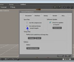 Bevor Du aus Poser exportierst, gehe zu "Edit - General Preferences". Auf dem Tab"Misc" deaktivierst Du die Option "Use external binary morph targets". Dann exportiere das ganze als obj, wie gehabt. Beim Import in Cinema konnte ich die posierte Figur auch ohne das InterPoser-Plugin laden, also über den ganz herkömmlichen Import.