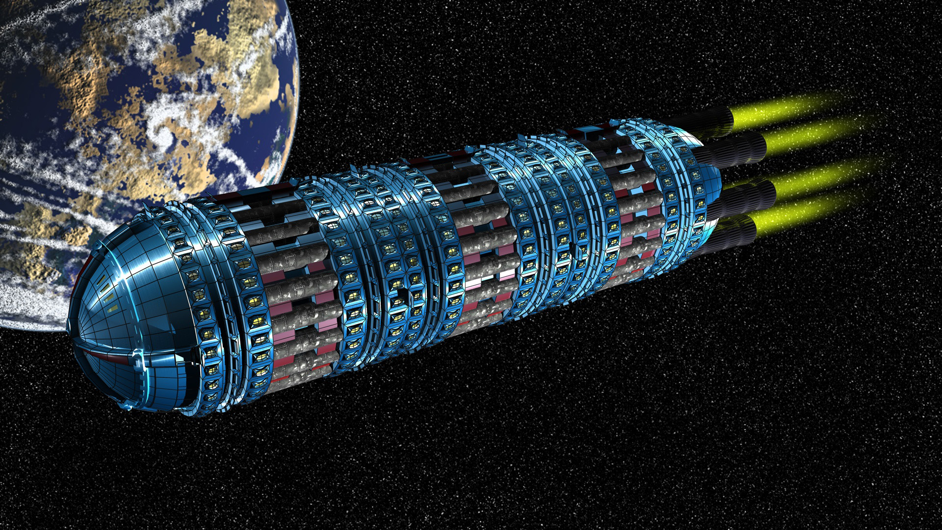 Jou, sieht jetzt sehr grafisch aus... Die Antriebsstrahlen haben additives Licht? (Weil die Sterne dahinter auch heller geworden zu sein scheinen - normalerweise wären die ja eher von den Energieemissionen überstrahlt).
