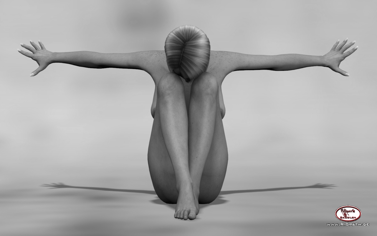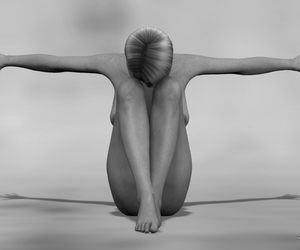 Sehr gelungene Pose, die wegen des schwarzweiss-Effekts den Eindruck eines künstlerischen Fotos erweckt. Das Einzige, was es etwas unnatürlich wirken lässt ist m.E. das Haar - dort müssten einige Strähnen zumindest der Schwerkraft folgend herab hängen...