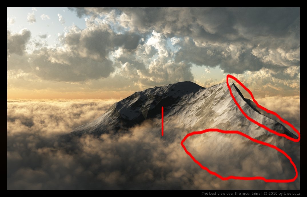 Darüberhinaus wirkt der Berg nach hinten hin zu ausgeschnitten - als ob Du eine Collage gemacht hättest. Für einen Grat wie diesen hier benötigst Du aus diesem Blickwinkel nach hinten eine andere Tiefe - ich hab die Stelle mal eingekreist.