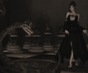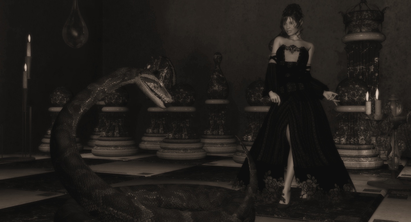 Mit einer riesigen Schlange auf einem riesigen Schachbrett, dass kann ja nur ein Alptraum sein. Als SW-Bild sehr ansprechend. Die Dame kommt sehr natürlich rüber und das Kleid ist wunderschön.