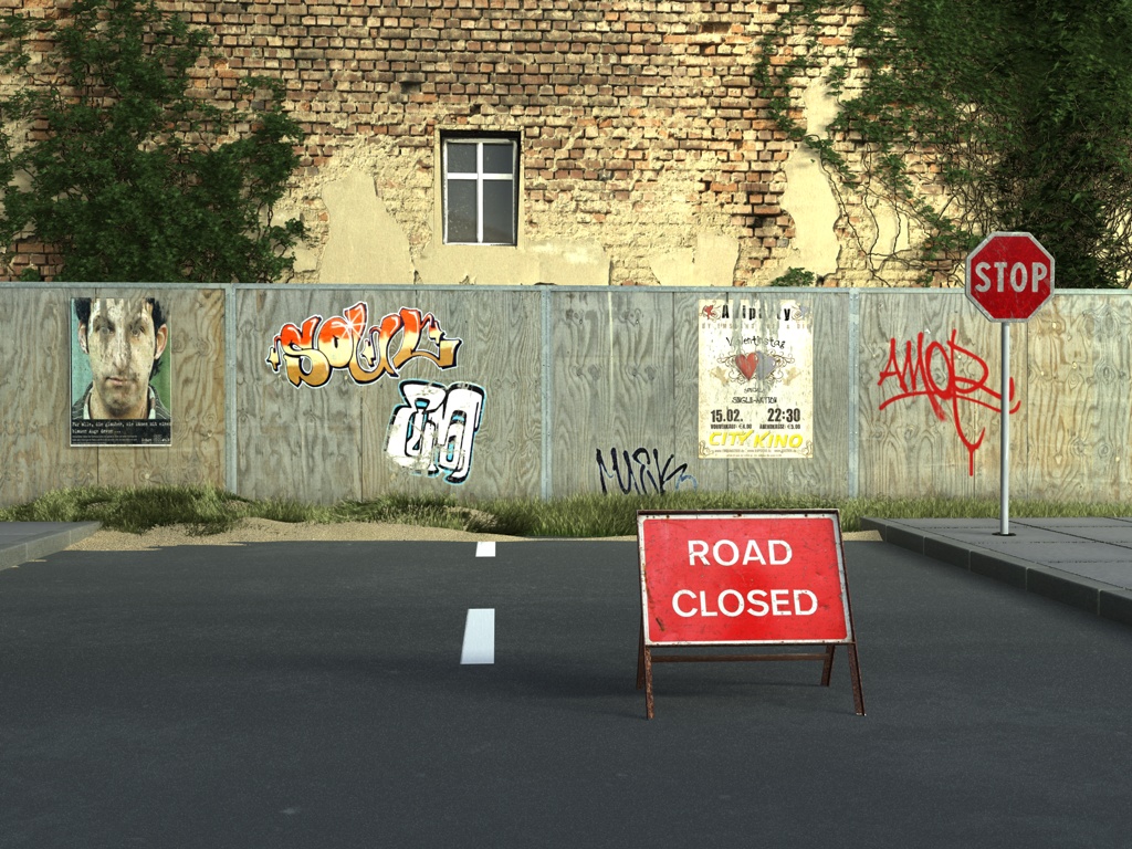 Idee war eine ganz neue Strasse, die einfach auf Grund von Fehlplanungen einfach angefangen wird, obwohl noch ein Haus im Wege steht. Die Bauarbeiter haben sich auch keine Rübe gemacht. Frei nach dem Motto : Not my job !