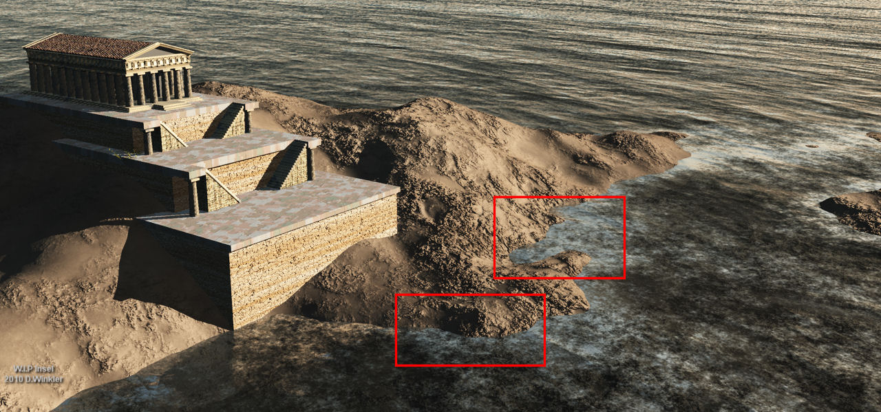 Mein erstes Bild in Vue 8 (gekauf bei der letzten Preisaktion, vor Erscheinen der 9er Versionen) - Eher ein Test für den Import aus Cinema 4D (Tempel links) und einigen Einstellungen für Material. Beim Probieren am Wassermaterial bin ich mit dem Ergebnis nicht zufrieden. Die Ränder (besonders die rot markierten Stellen) sehen mir zu glatt aus - irgendwie fehlen die kleinen Wellen, die normalerweise vom Felsen wieder zurückgeworfen werden...