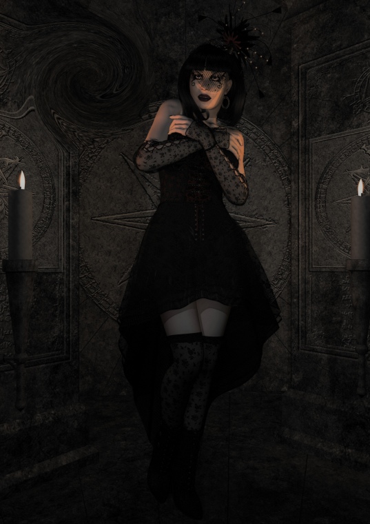 Schickes Outfit und gelungenes Posing. Mit dem Licht hab ich keine Probleme, düster soll es wohl sein und die Kerzen kann ich mit den beleuchteten Stellen am Gesicht und den Armen durchaus in Verbindung bringen. Einzig die fehlende räumliche Tiefe stört minimal.