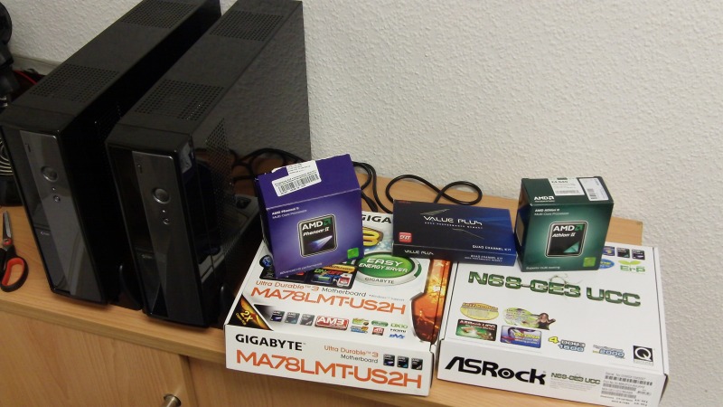 Ich baue jetzt wohl zwei Rechner mit Mini ATX Mainboards auf. Einer bekommt eine AMD Athlon II 640 CPU mit 4 Kernen, der andere einen AMD Phenom II X6 mit 6 Kernen - beide jeweils 3 GHz Takt. Jedes System bekommt vorläufig 8 GB RAM spendiert, mit der Option auf 16 GB aufzurüsten. Jeweils ein flaches Desktop Gehäuse und eine stromsparende Festplatte sind auch notwendig. Ich hoffe, ich bleibe unter 650 Euro Hardwarekosten.
