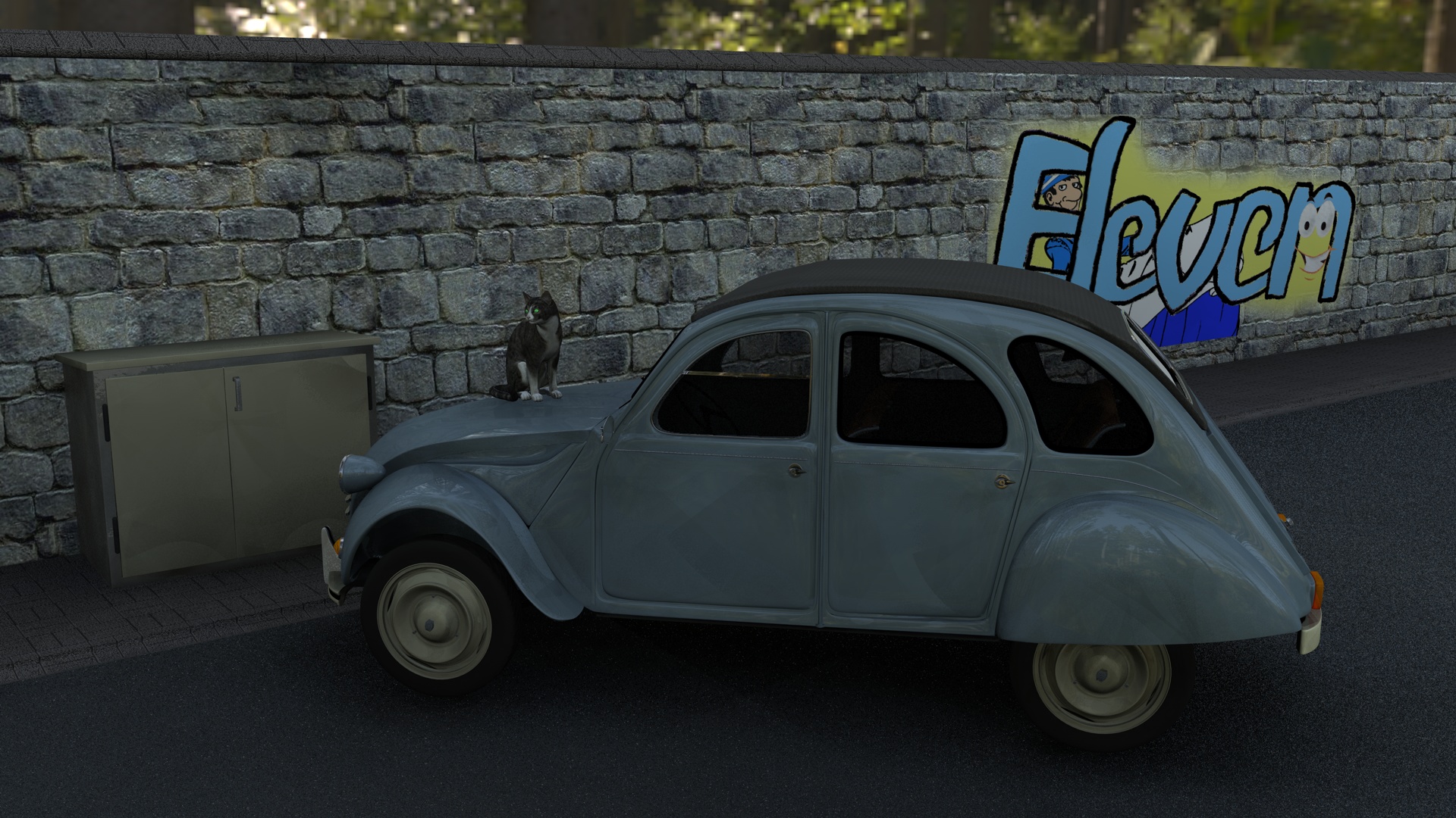 hübsche szene und mit hdri´s kann man wirklich feine sachen machen. was mir nicht gefällt ist erstmal die katze am auto, die wirkt auf mich zu gewollt und sitz auch icht 100 am auto drauf. also vom winkel her. die haube macht nen bogen und die katze ist waagrecht drauf, passt nicht. bin mir auchnicht sicher ob die richtig gespigelt ist.