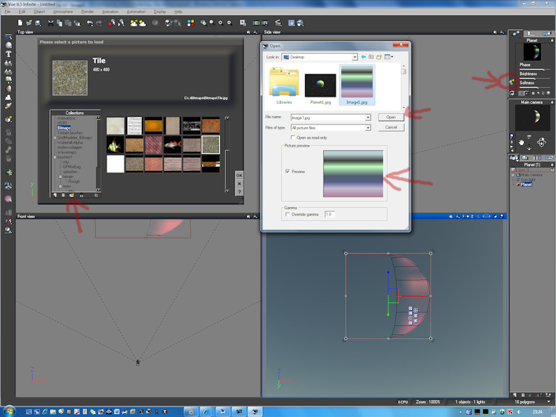 Zum einen kannst Du eine Kugel erstellen und das Bild im Materialeditor drauflegen - ich hab das dann noch mit einem Wolkenlayer etwas verbessert und das Bild im Materialeditor im Effektetab leuchtend eingestellt.