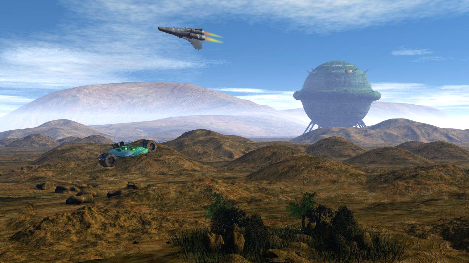 Der erste Render mit Bryce 7 pro ist fertig. Da mußten ein paar alte Raumer aus dem Perryversum für herhalten.