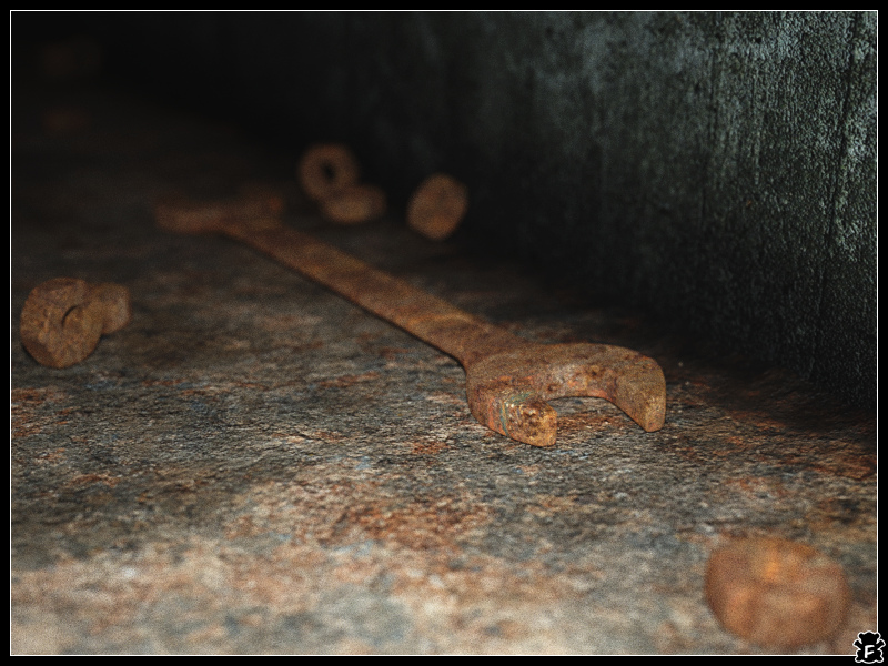 Ein rostiger Schraubenschlüssel mit Blitzlichteffekt.