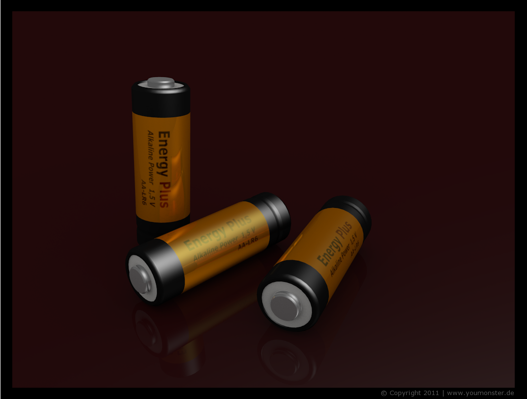 Die Batterien sind komplett in Blender 2.56 modelliert, inkl. Materialzuweisung, UV-Mapping für die Schrift und Beleuchtung.