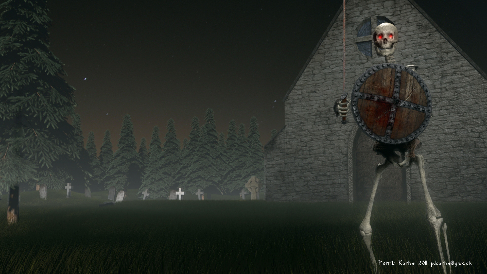Ich würde die Szene für eine Bewerbung als zu verspielt ansehen. Das Thema Friedhof und Skelett hat man schon so oft gesehen. Außer die Szene soll für ein Game Design dienen.