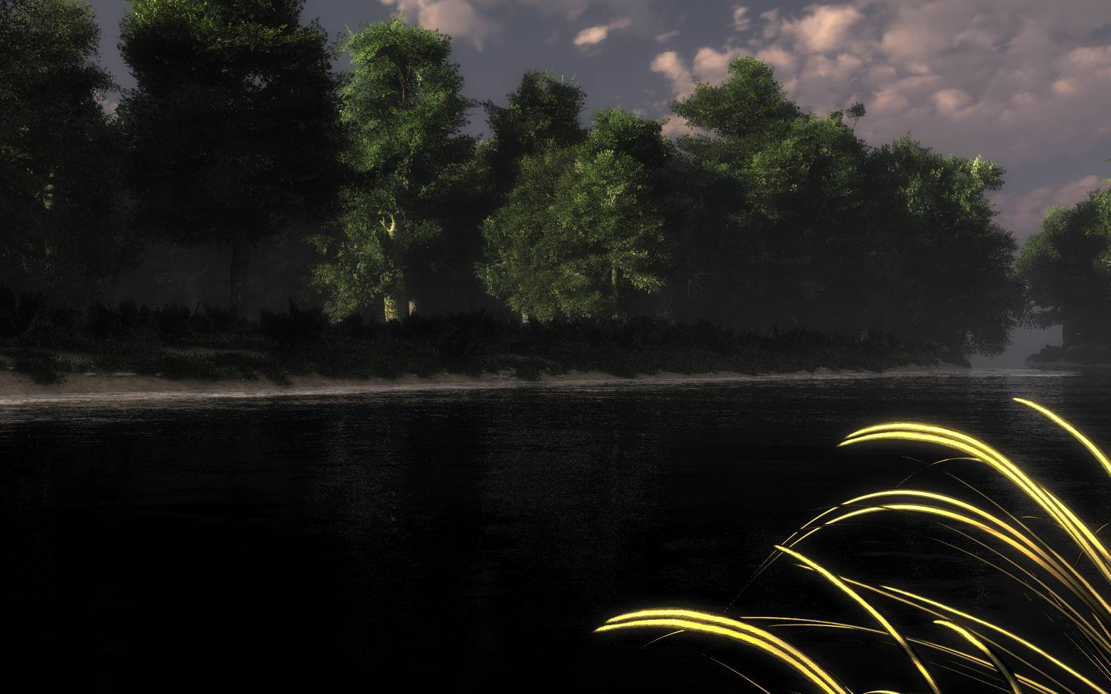 Ansonsten schon nicht übel. Die Steine am Ufer könnten ein wenig tiefer und die Bepflanzung wirkt noch etwas eintönig; Licht ist schon Top...Probier doch mal direkt vor der Sonne ein Punktlich zu setzen, ev. volumetrisch und mit einem leichten gelb Ton.