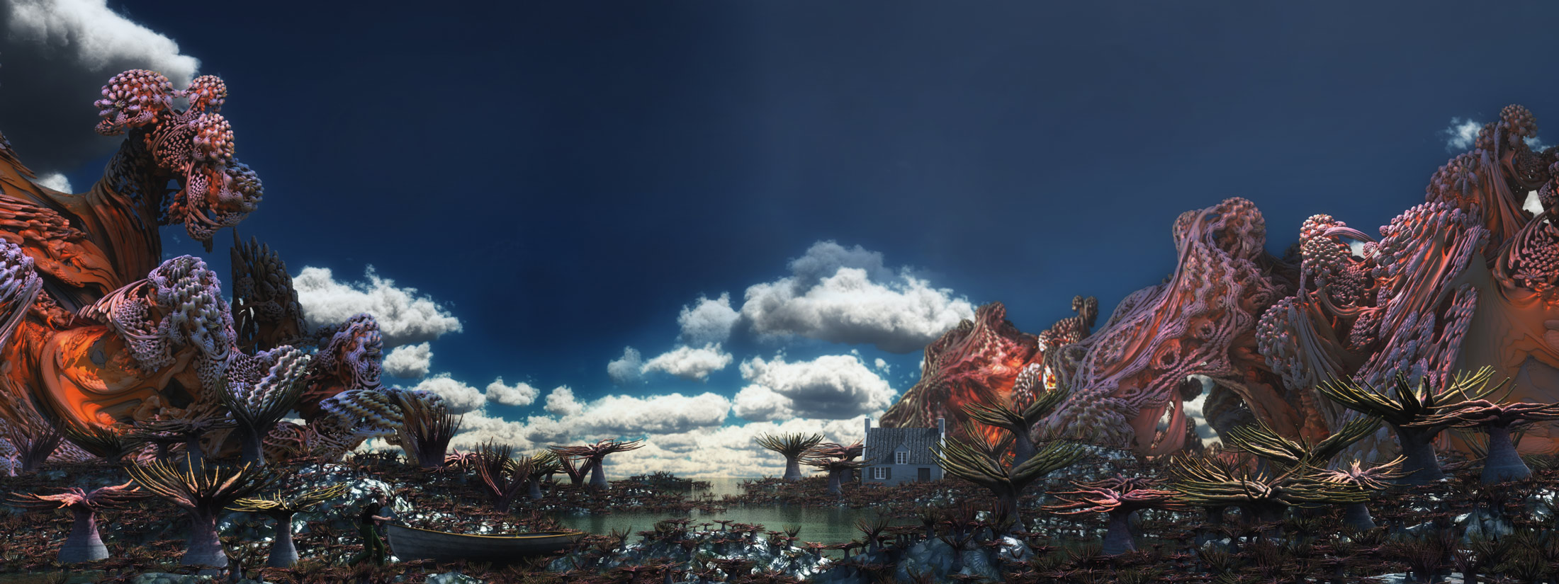 In Mandelbulb kannst Du ein Hintergrundbild einfügen. Ich habe hier einen in vue erstellten Himmel mit Wolken als Hintergrund genommen und die rechten Fraktale erzeugt. Das so entstandene Bild war wiederum der Hintergrund für ein 2. Mandelbulbbild mit den Fraktalen links. Das nun entstandene Bild habe ich als Alphaplane in Vue importiert - als Hintergrund für die in Vue erzeugte Vordergrundlandschaft mit Haus, Boot, Felsen, Wasser etc. ... Die Beleuchtung war Fummelei und sollte unheimlich-surreal wirken. Benutzt habe ich mehrere Spots und einen Spot mit volumetrischem Licht von rechts oben. PW gab es keine, sah auch so schon seltsam genug aus ..... tja, wuselig sollte es sein, aber wohnen möchte ich da ehrlich gesagt lieber nicht . eher etwas für schlaflose Nächte .....