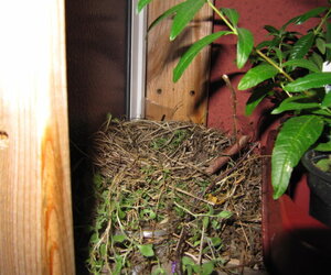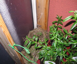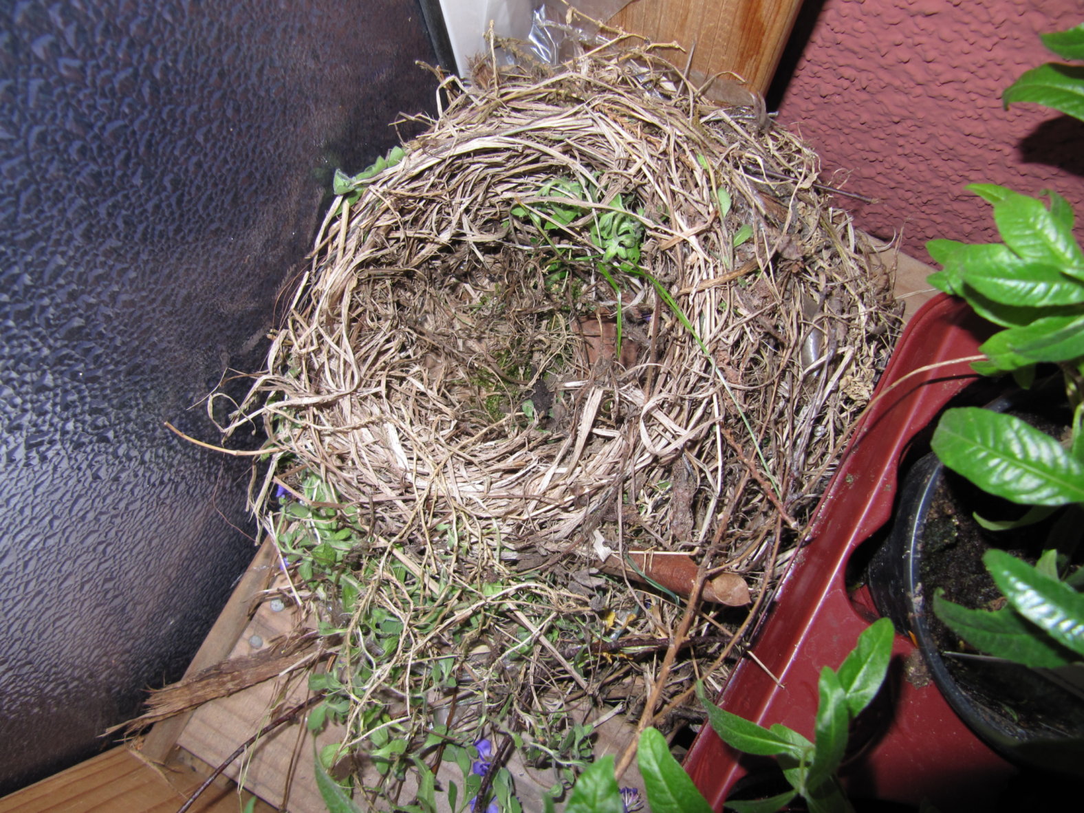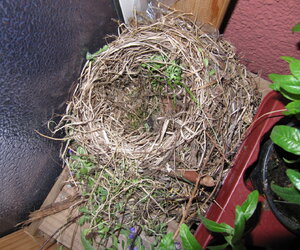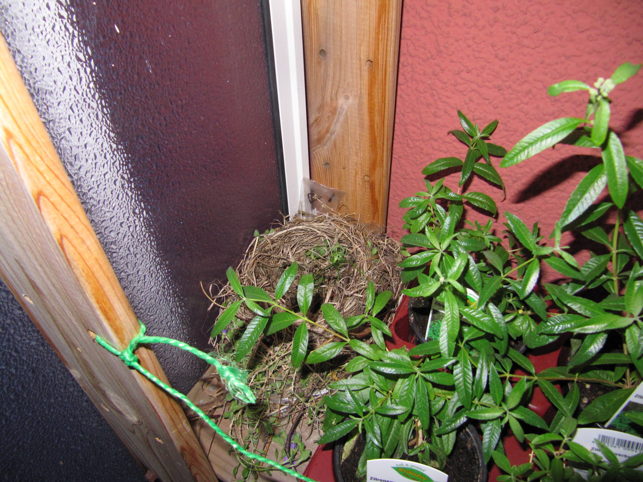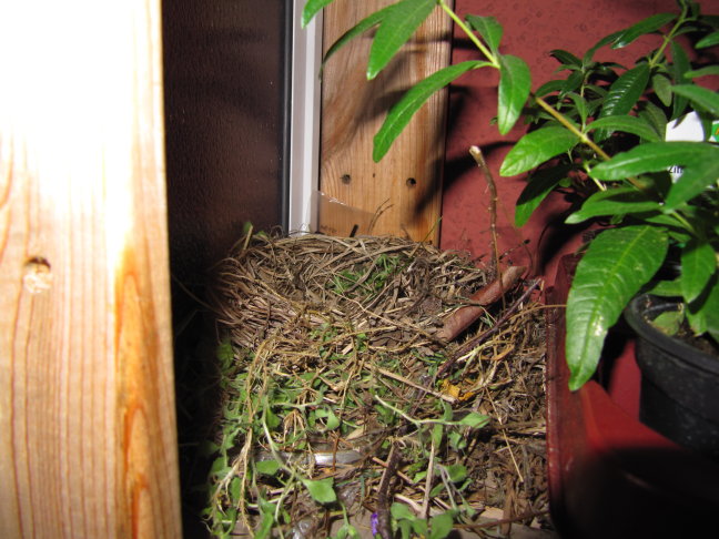 - meine Zaungäste haben sich aus Heu, Stroh, Vogelmiere und was ich sonst noch auf dem Balkon liegen hatte, ein Nest in die Regalecke gebaut.