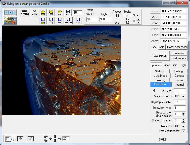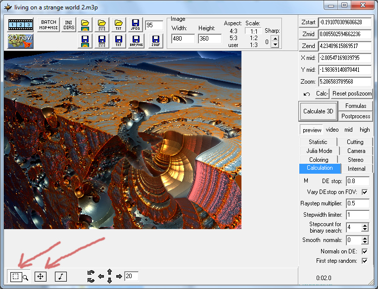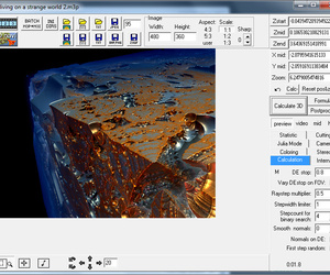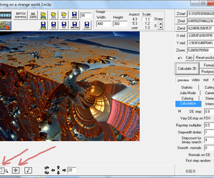 @ Lichtfänger, den Ausschnitt habe ich gewählt nachdem ich das Fraktal mehrfach gedreht habe und reingezoomt habe. Den finalen ausschnitt kann man einfach mit der Maus umranden, wenn man den Knopf ganz unten links im Hauptfenster Mandelbulb 3d nimmt. Mit dem daneben kann man dann noch den Ausschnitt etwas hin und herrücken bis er so passt, wie man ihn haben will. und mit dem in der Mitte kann man die Perspektive wählen, bis sie gefällt, das Fraktal wird um die jeweilige Gradzahl (in meinem Fall 20 Grad in der jeweiligen Richtung auf die Du drückst (hoch, runter, links rechts) geschwenkt.