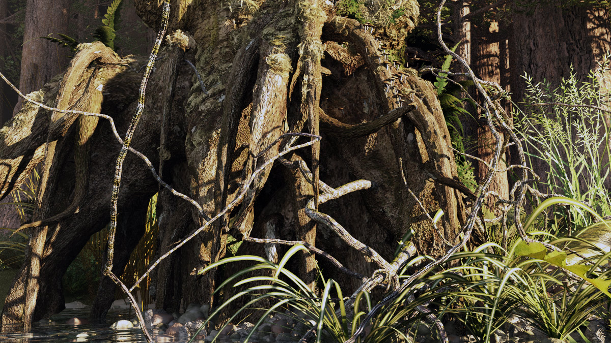 Lass einen Menschen von einer dieser Wurzeln sich abseilen z.B. oder setz ne Riesenlibelle, die sich gerade sonnt auf/an eine der Wurzeln. Ein aus dem Wasser hochspringender Fisch....so mehr fällt mir nicht ein