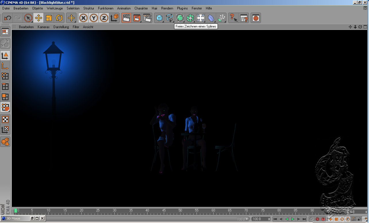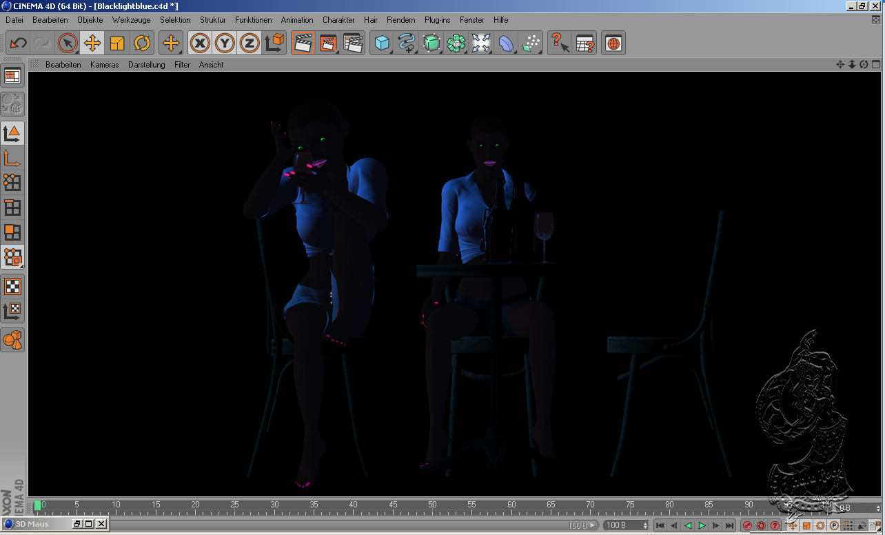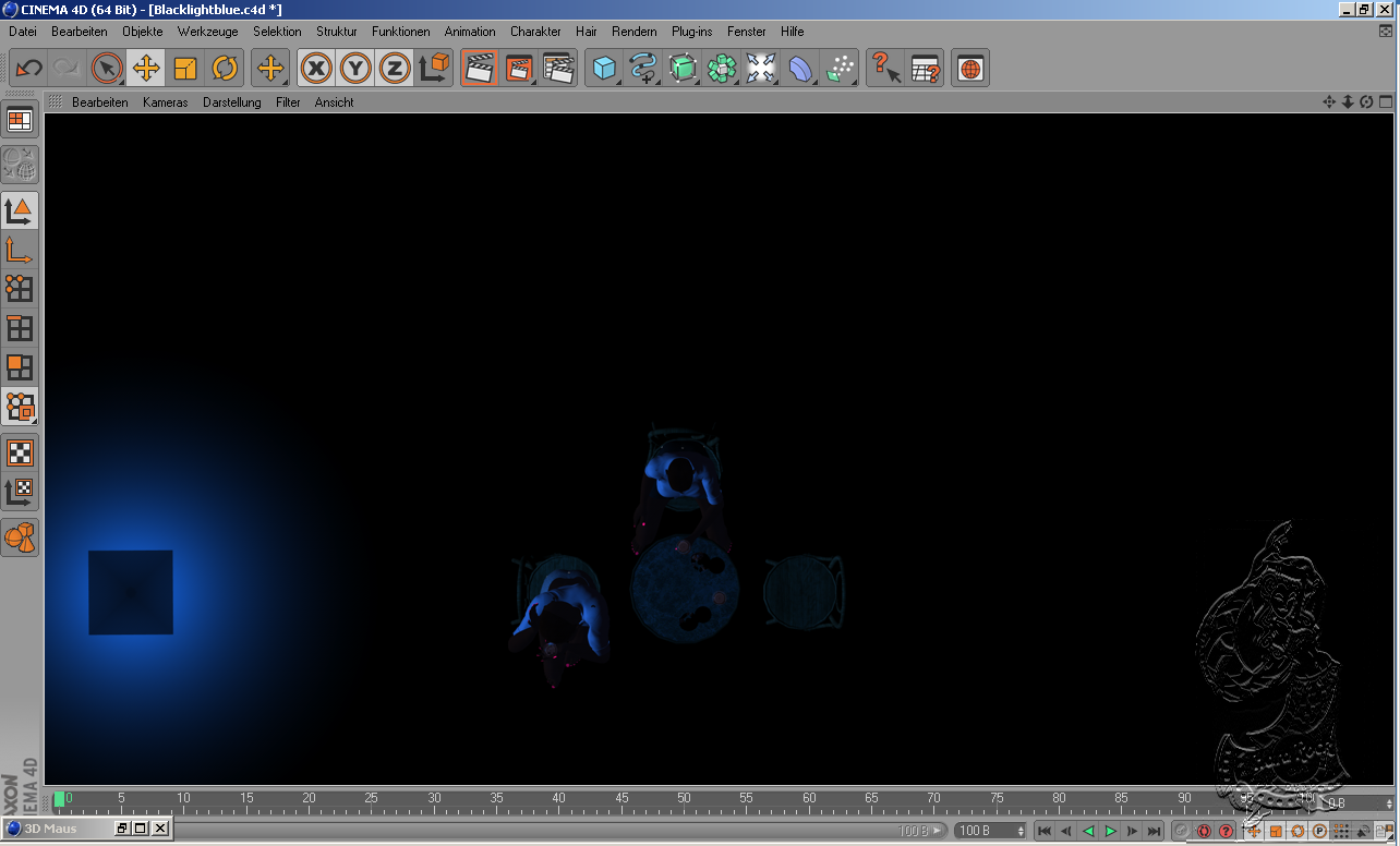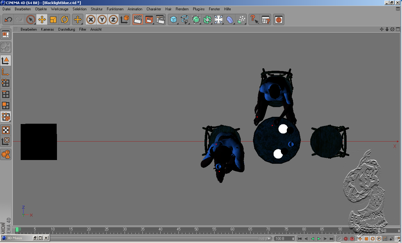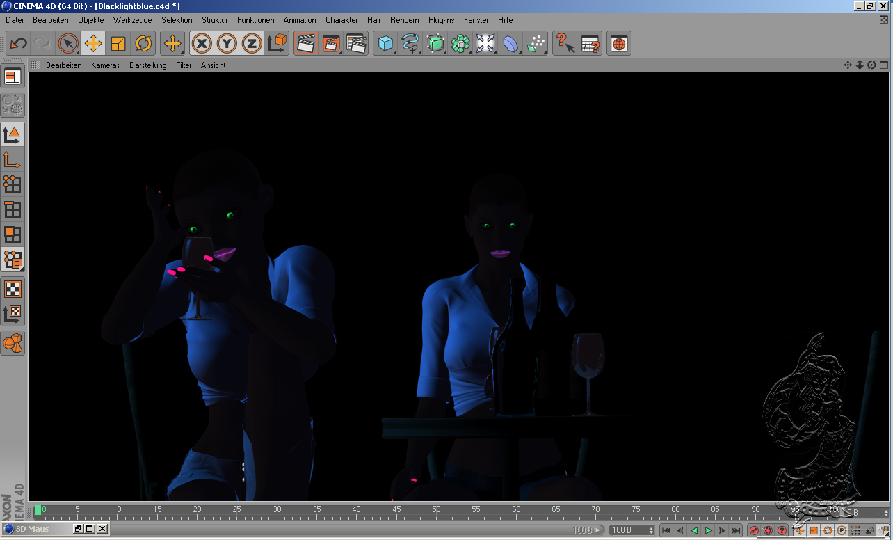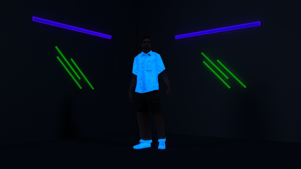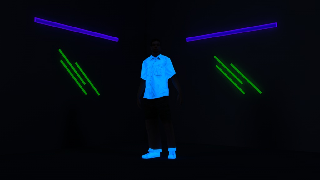 Ich habe mal versucht Schwarzlicht herzustellen. Die Gesammt Bühne wird mit einer Lichquelle Farbe Schwarz beleuchtet.Da sonst die Haut der Personen nicht zusehen sind wenn mit Lampe Blau ausgeleuchtet wird,dh. die einzelnen Objekte welche durch Blacklightblue angeleuchtet werden müßen direkt der Lampe blau zugewiesen werden.Die Augen wurden direkt zugewiesen und es wurde die Farbe Grün gewählt, bei Finger und FußNägel wurde genauso verfahren allerdings in einer anderen Farbe das gleiche mit Gläsern und Flaschen.Leider ist es mir nicht möglich ein Lebendes Objekt zufinden welches ich unter Schwarzlicht mit reflektierenden Farben bepinseln darf.