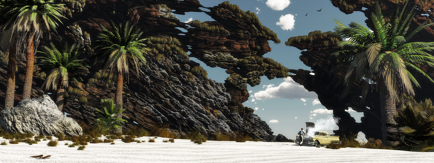 ..... wieder ein Mandelbulbvueposerphotoshopwerk . Diesmal habe ich die Mandelbulbstruktur als Heightmap für Vueterrain und Textur benutzt. So liess sich das Ganze mit Ecos bepflanzen. Der Qualm ist pw ....