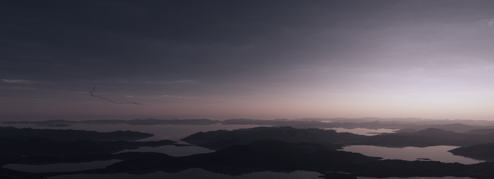 und noch ein Athmospherenexperiment in Vue, diesmal mit einem unendlichen Terrain etwas Wasser und vielen Wolken und einem der feinen Zugvögelobjekte von Barry