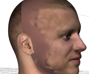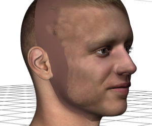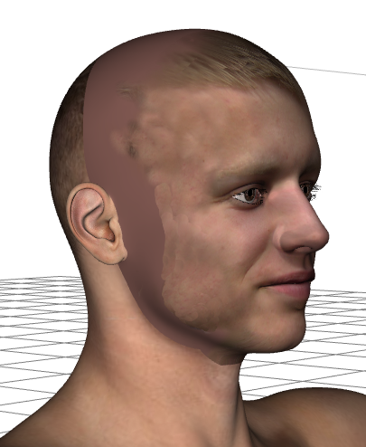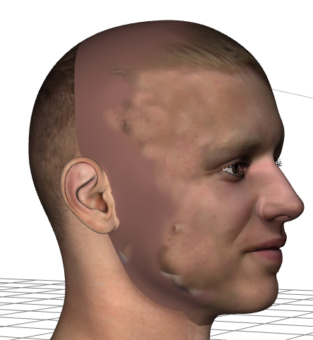 Klar ist, dass man aus einem Foto natürlich keine komplette Textur ziehen kann. Üblicherweise reicht es nur für eine Hälfte - und auch hier sind hochauflösende Fotos ratsam. Die Textur muss auf alle Fälle nachbearbeitet werden. In meiner letzten Version des Programms gab es die Möglichkeit, die generierte Textur in der Mitte zu spiegeln - ist als erster Ansatz ganz gut, aber da menschliche Gesichter nun mal nicht symmetrisch sind führt kein Weg an einer aufwändigeren Überarbeitung nach Fotoreferenz vorbei, will man eine gewisse Ähnlichkeit herstellen.